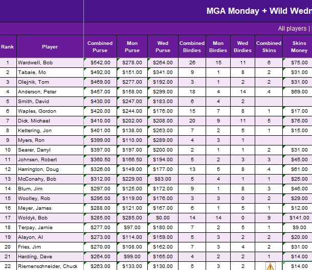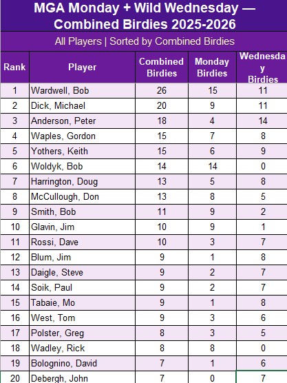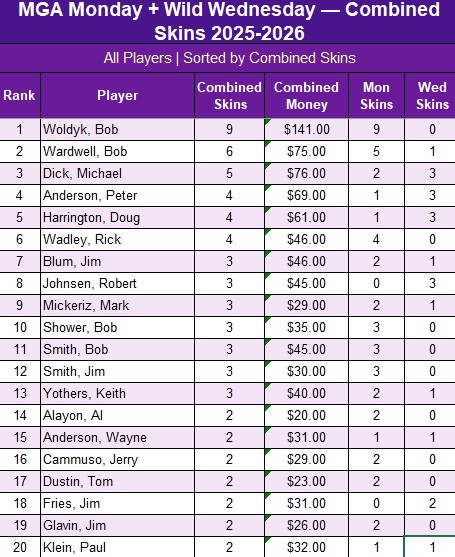Includes data from Opening Day 110325 through 032326 for both Monday and Wednesday MGA rounds